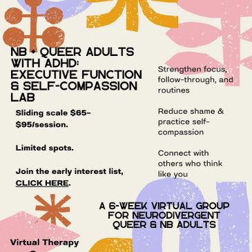 A 6-week virtual group for non-binary and queer adults who live with ADHD and want to build practical skills for focus, follow-through, and self-kindness. Each week we blend executive-function strategies with neurodivergent self-acceptance, shame reduction, and community support from others who get it.