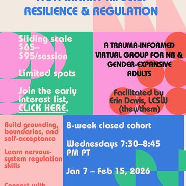 A closed, 8-week virtual group for non-binary and gender-expansive adults seeking community and trauma-informed tools for grounding, boundaries, and self-acceptance. Each week blends reflection, nervous-system regulation, and supportive connection with others who get it.